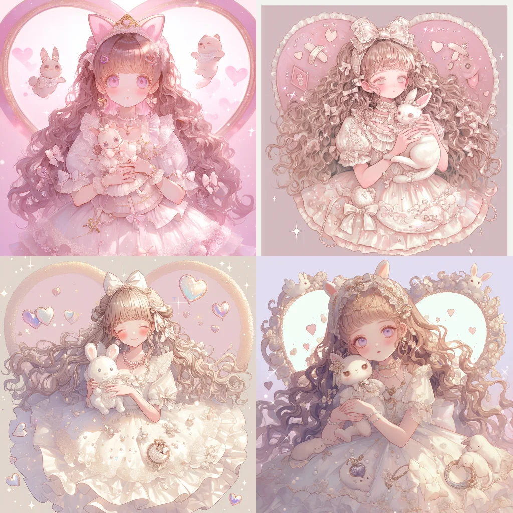 AI Prompt A delicate illustration of a girl with long curly brown hair, wearing a white lace Lolita dress with frills and pearls, holding a small doll, accompanied by a white cat, surrounded by a heart-shaped frame with sparkles and cute rabbit motifs, in a soft and dreamy style. --niji 6 中文大意:精致的插图,描绘了一个留着棕色长卷头发的女孩,穿着带有褶边和珍珠的白色蕾丝洛丽塔连衣裙,手里拿着一个小娃娃,身边有一只白色的猫,周围是带有闪闪发光和可爱兔子图案的心形框架,风格柔和梦幻。 --二司6 查看更多手绘/插画 |