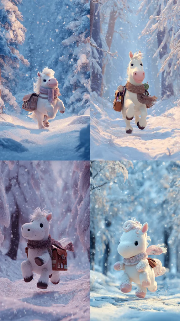 AI Prompt A cute little white horse, carrying a small schoolbag and a scarf, was running in the snow of the forest. Snowflakes fell, the trees covered, and the ponies were running happily. The footprints left a deep mark and carried a warm and happy atmosphere. Disney-Pixar style --ar 9:16 中文大意:一只可爱的小白马,背着小书包,戴着围巾,在森林的雪地里奔跑。雪花飘落,树林掩映,小马欢快地奔跑着,脚印留下深深的印记,带着温暖和快乐的气息。 Disney-Pixar style --ar 9:16 查看更多图标/海报/UI |