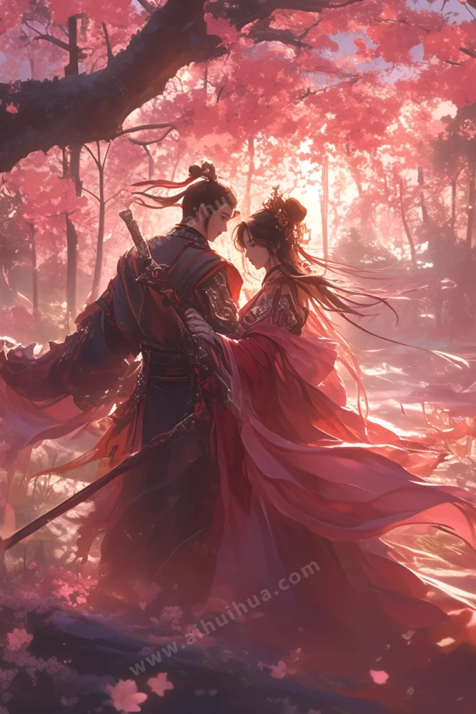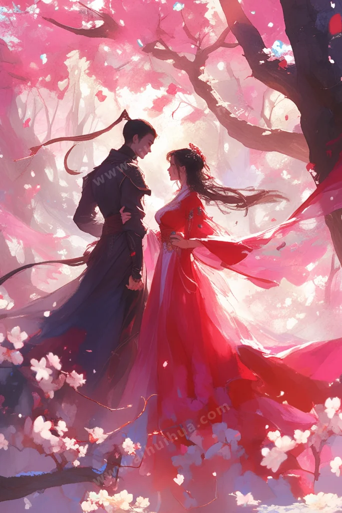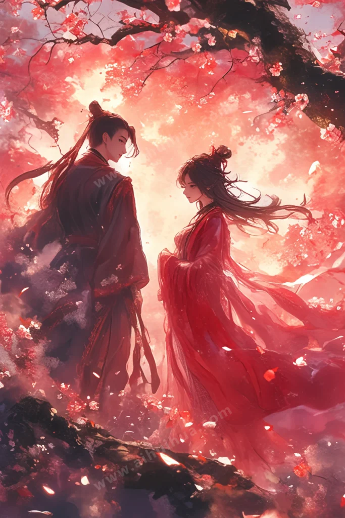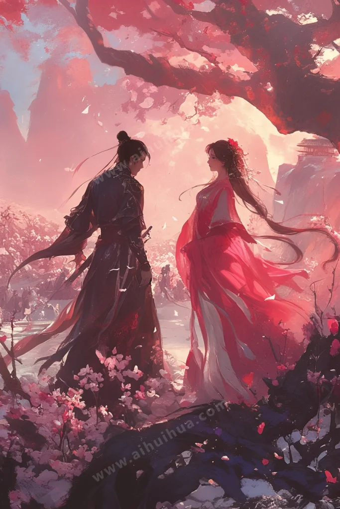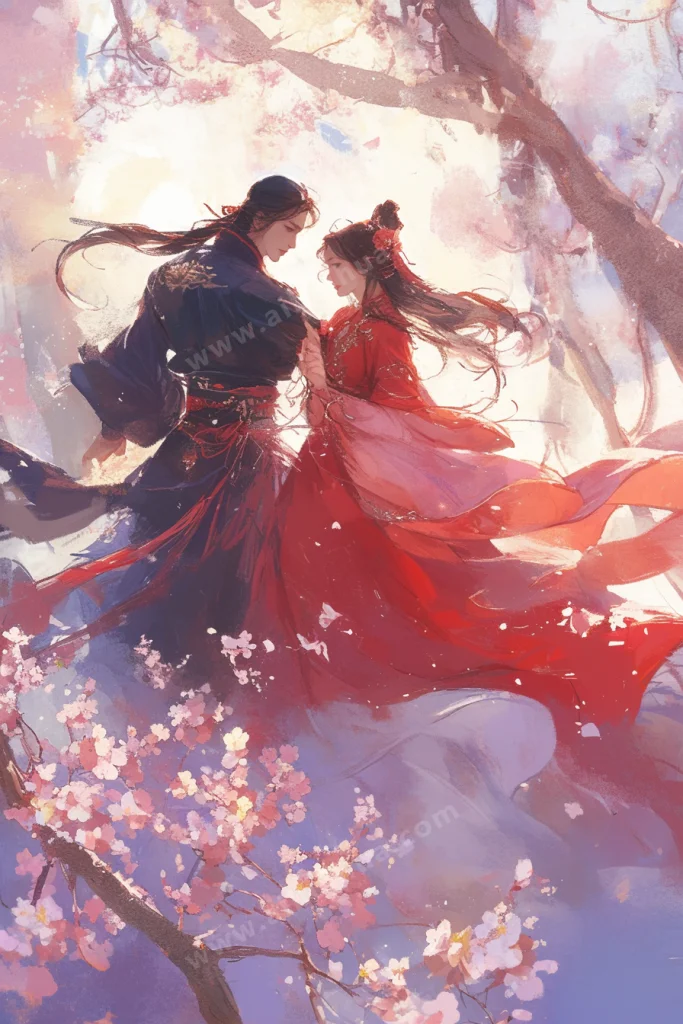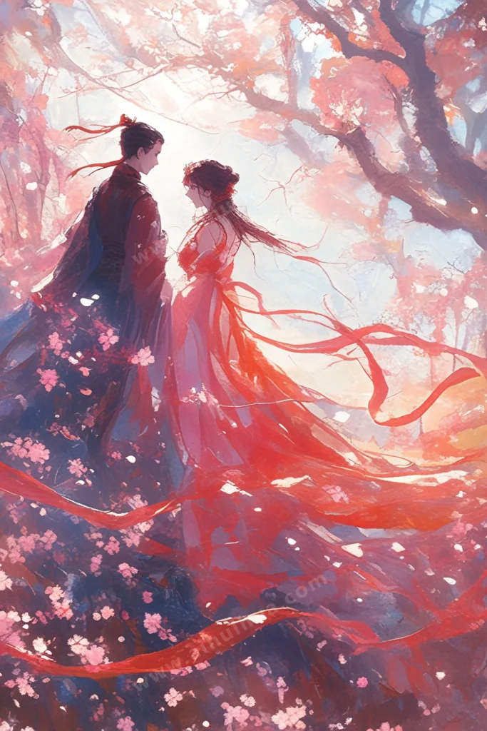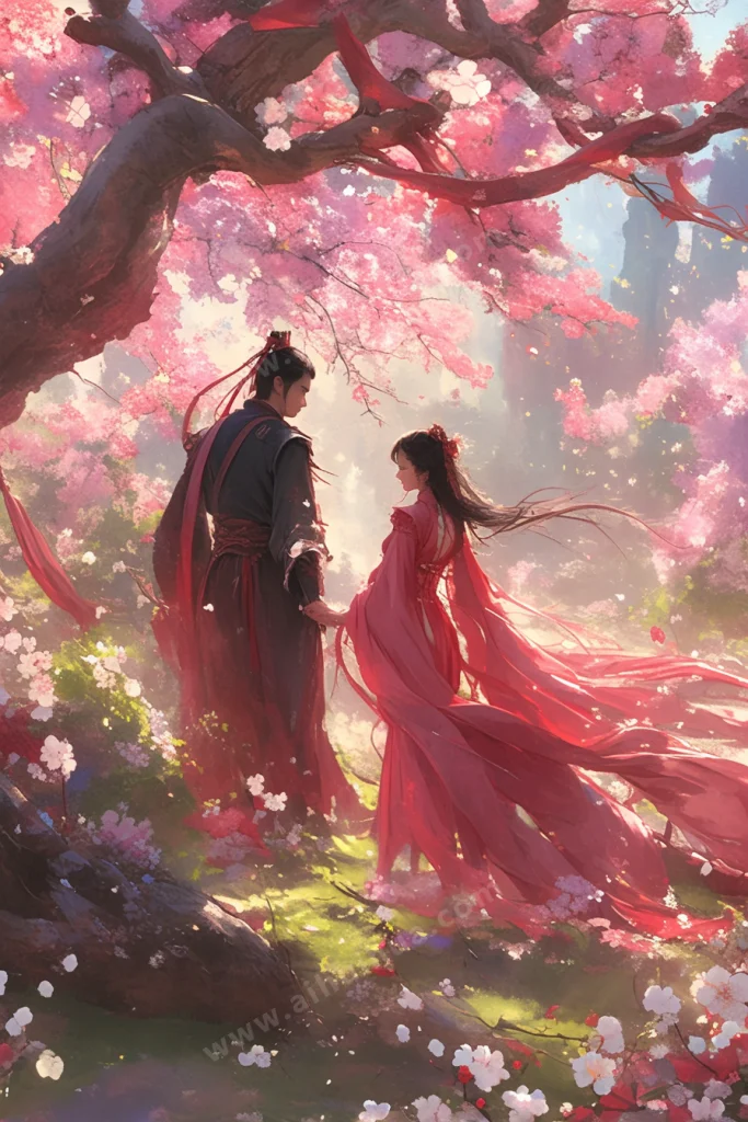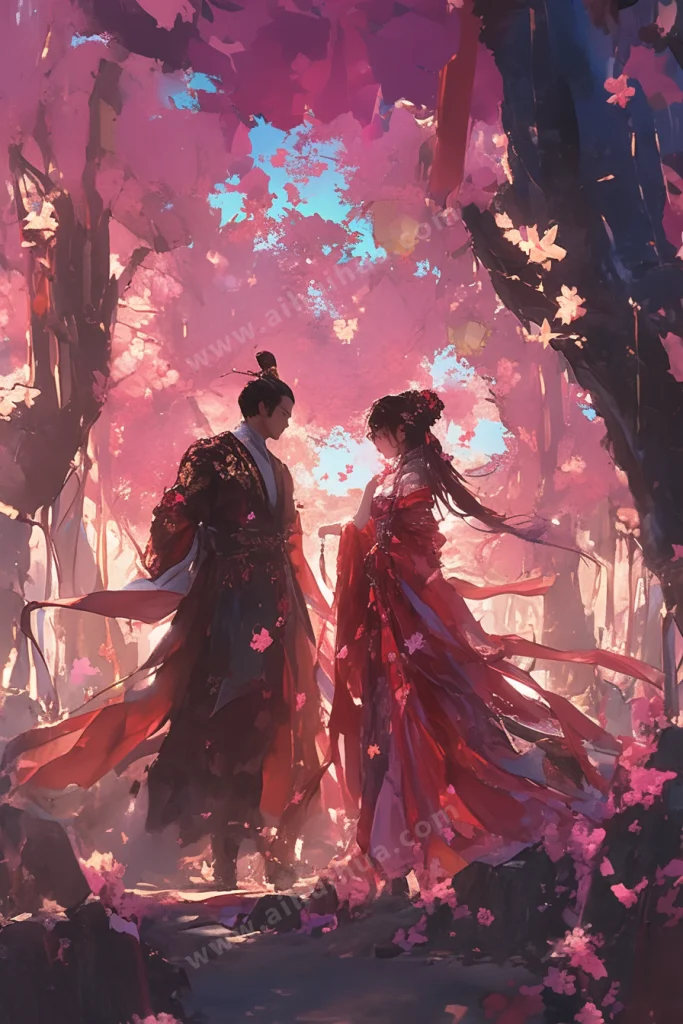 两个古代中国人物矗立在樱花林中的美丽景象。男子穿着深色传统服装,女子则穿着鲜艳的红色礼服。柔和的阳光透过树木,周围点缀着精致的粉红色花朵。风格是空灵浪漫的中国画,笔触细致,色调温暖。 --ar 2:3 --niji 6