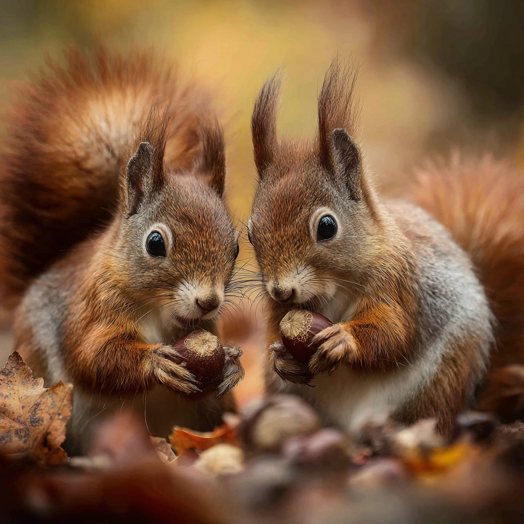 提示词(Prompt) 秋日林地,松鼠抱果特写,栗色尾巴与大眼睛,高清动物摄影特写风格,尾巴蓬松细节,晨光点缀落叶与松鼠毛发,画面灵动温暖 |