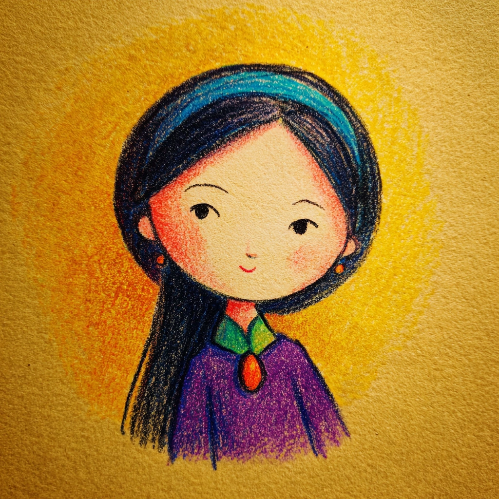提示词(Prompt) 儿童绘画风:年轻东方女性被简化为大圆头与短肢,稚拙线条不均匀,蜡笔质感填色,明亮天真调色,纯真笑容 |