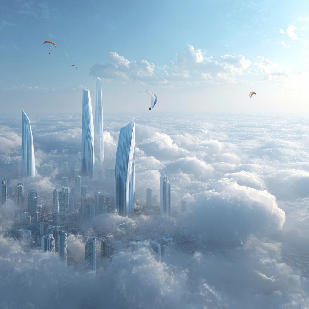 提示词(Prompt) 飞行城市高空,云层中悬浮摩天楼与空中小艇,天蓝与白色搭配,极简未来风格,建筑线条流畅,云雾与阳光交融,空间立体 |