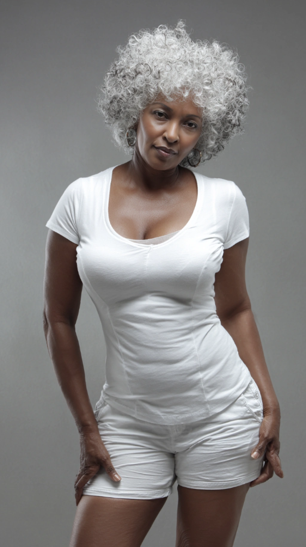 提示词(Prompt) 非洲 70岁的女装模特站立,穿着纯白短T恤和白色短裤,姿势休闲,双手在外面放松,中性灰色背景,全身丰满,极简主义工作室灯光 --ar 9:16 --c 20 |