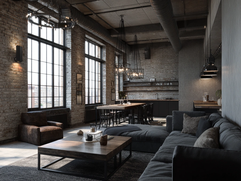 都市loft公寓,高挑空间与工业风管道设计,水泥灰与深褐色,工业极简风格,裸露砖墙和金属吊灯体现细节,大面积窗户投射晨光,空间感强烈,建筑设计效果图 --ar 4:3