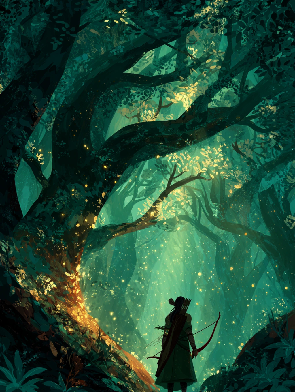 提示词(Prompt) 游戏精灵森林,弓箭手少女守护古树,翠绿与金色,奇幻自然风格,树叶纹理细致,光点穿梭林间,画面神秘安详 --ar 3:4 |
