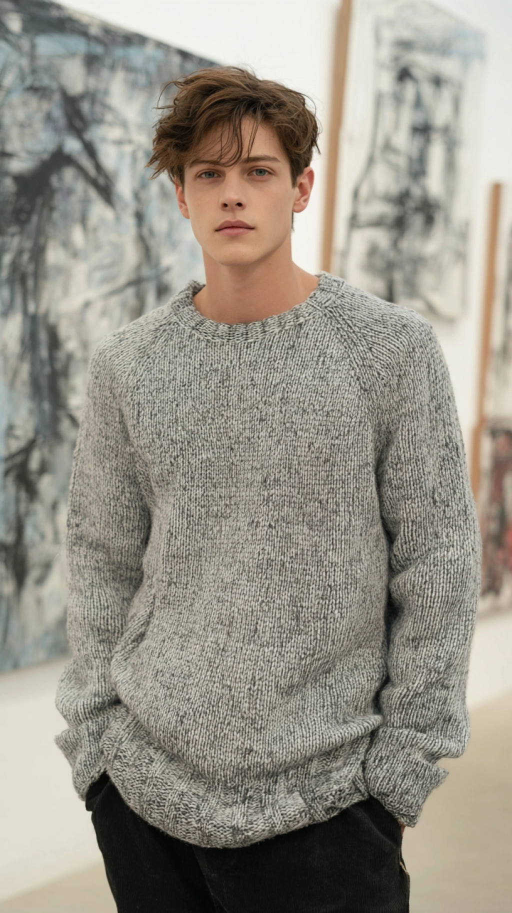 画廊墙前,男模特穿极简灰色毛衣,灰白色调,艺术文青风格,毛衣针织纹理细腻,画作与人物光影呼应 --ar 9:16