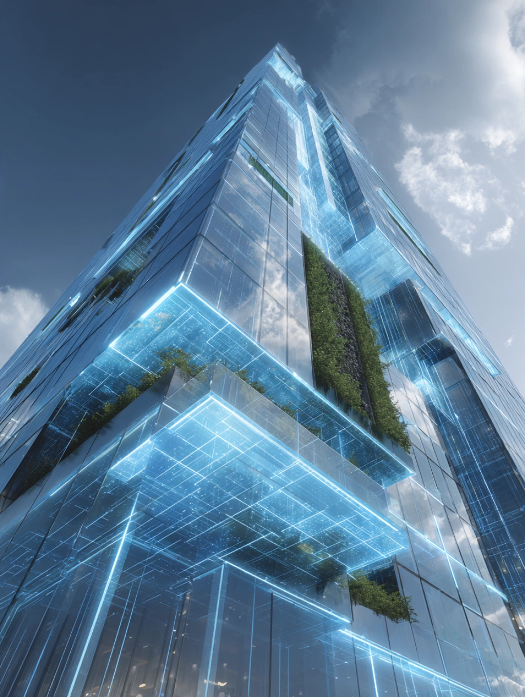 提示词(Prompt) 未来科技风格,高层玻璃建筑,悬浮平台,荧光蓝线条,智能绿植墙,云端视角,现代感强烈,极致细节,建筑设计效果图 --ar 3:4 |