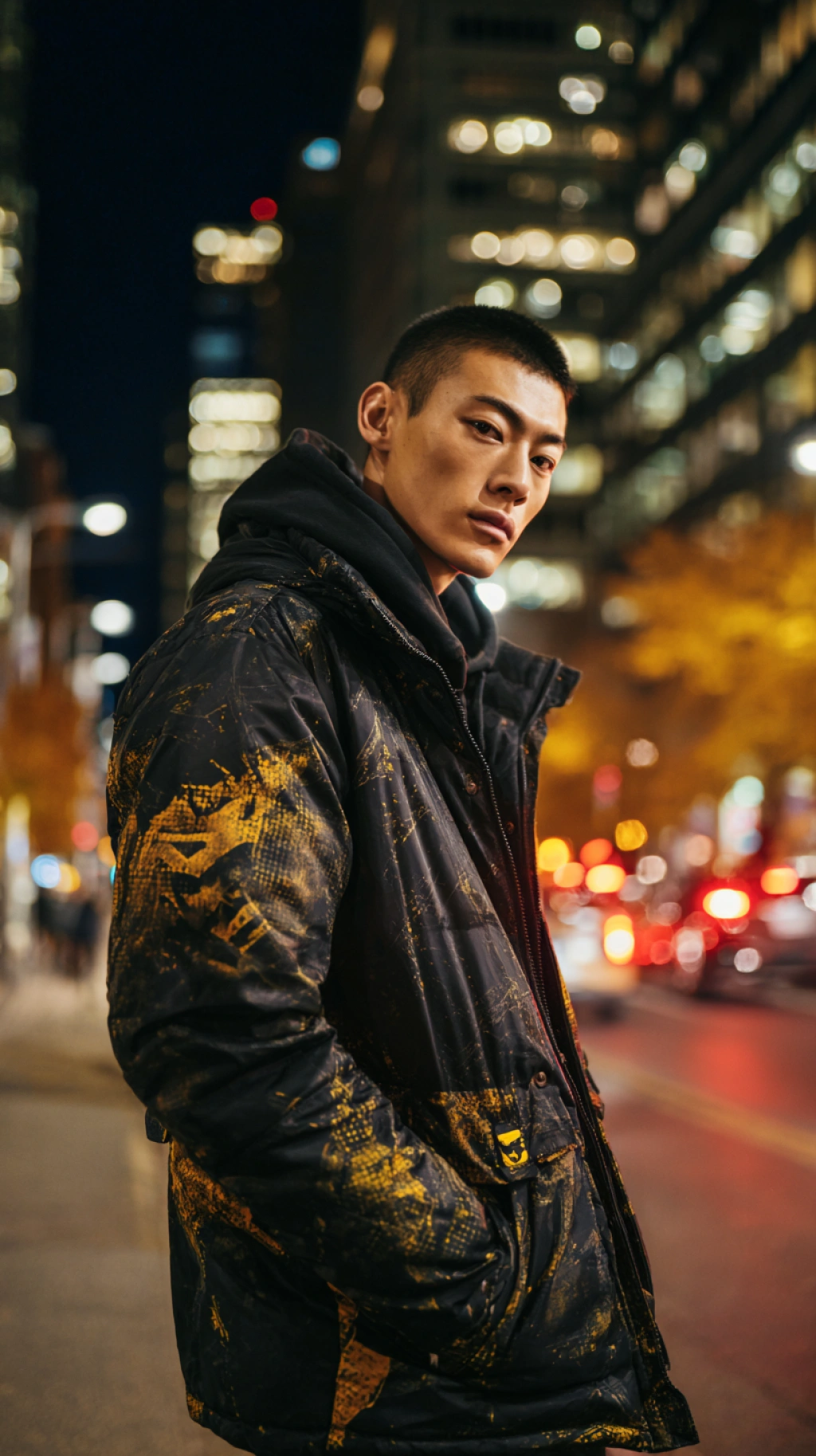 提示词(Prompt) 夜晚灯火街头,男模特穿黑色羽绒服,黑金色调,都市夜景风格,羽绒服亮面反光,街灯与车流形成动感光影 --ar 9:16 |