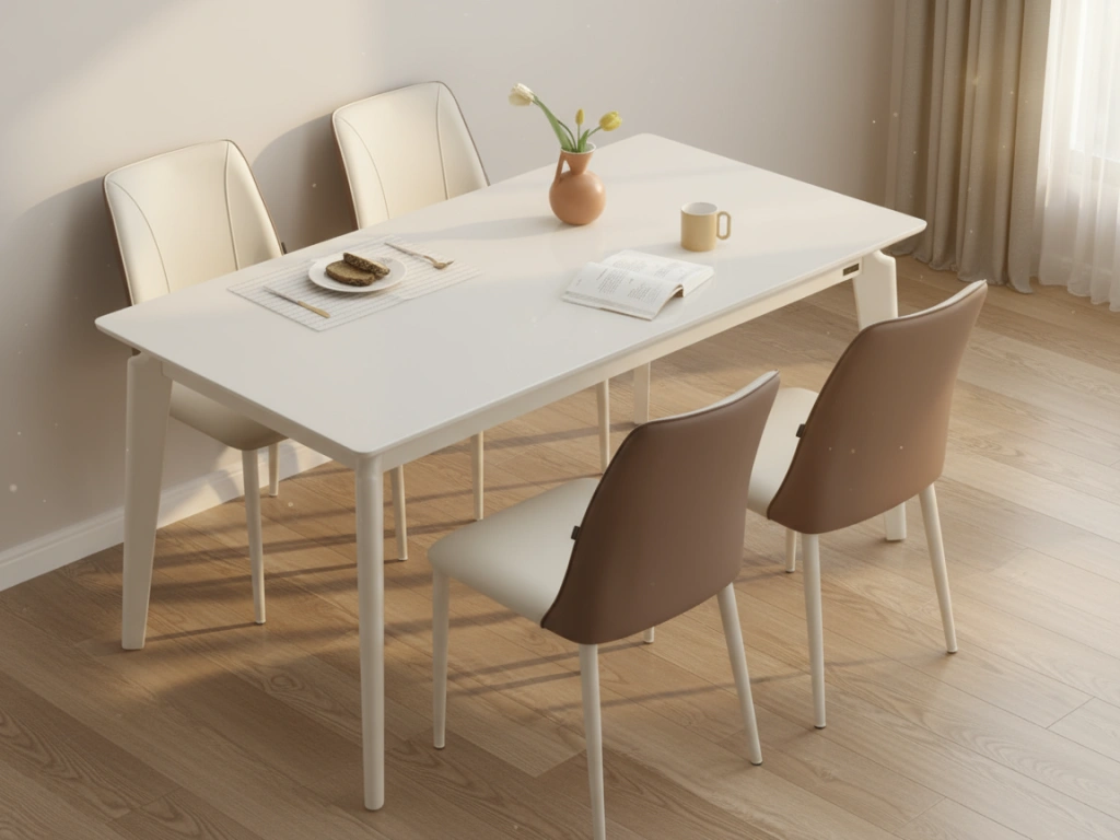 |   | 提示词(Prompt) 现代风格的客厅里的餐桌椅,阳光透过窗户洒在家具上,投射出温暖的光影。桌子背靠着墙,桌面上摆放着精致的花瓶和餐具,营造出舒适温馨的家居氛围。 使用的图片  |