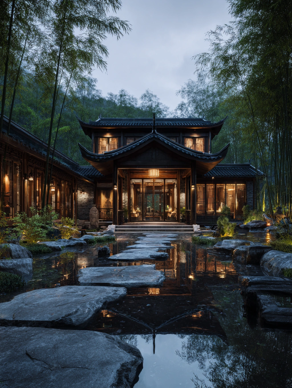 提示词(Prompt) 新中式风格,庭院别墅,飞檐翘角,木质结构,石板小路,池塘倒影,竹林环绕,静谧雅致,建筑设计效果图 --ar 3:4 |