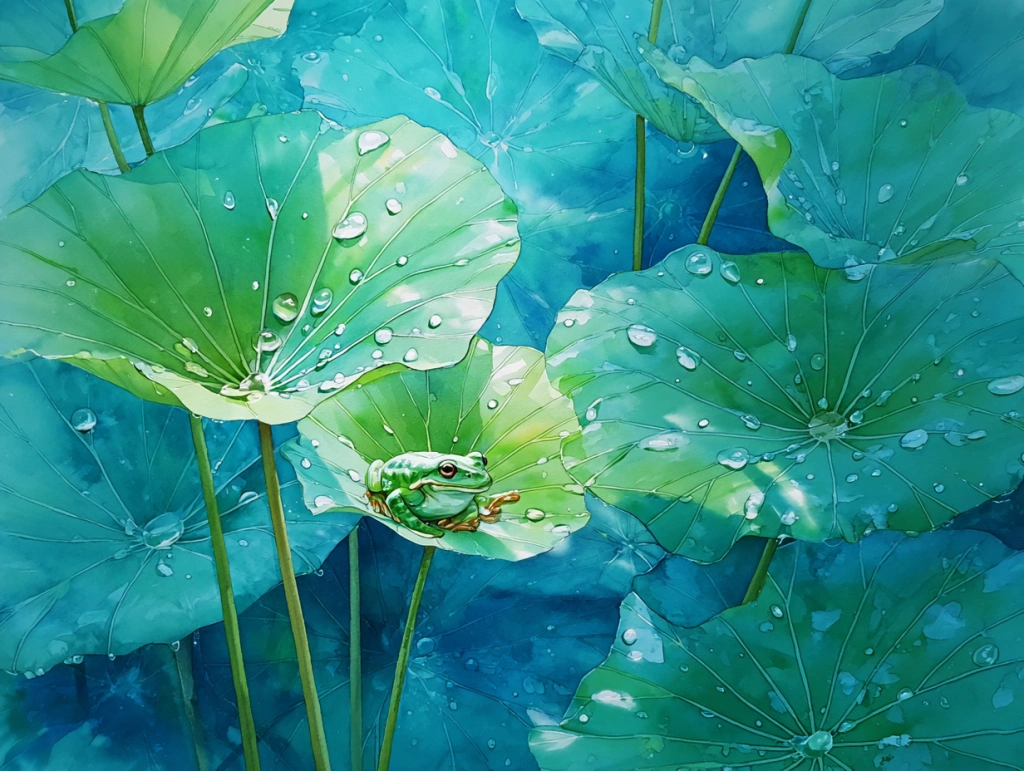 提示词(Prompt) 夏日池塘边,青蛙跳跃在荷叶上,翠绿与水蓝色调,清新童趣风格,青蛙皮肤有水珠细节,阳光洒落荷叶,画面灵动生机 --ar 4:3 |