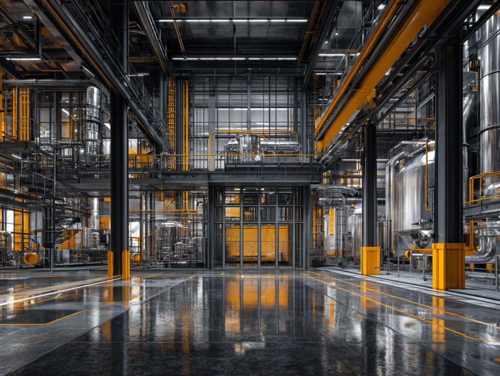 提示词(Prompt) 现代工厂车间,金属结构与大型机械设备,银灰与橙黄色调,高科技工业风格,管道纵横和地面反光细节,明亮工业灯光与机械阴影交错,空间宽阔,建筑设计效果图 --ar 4:3 |
