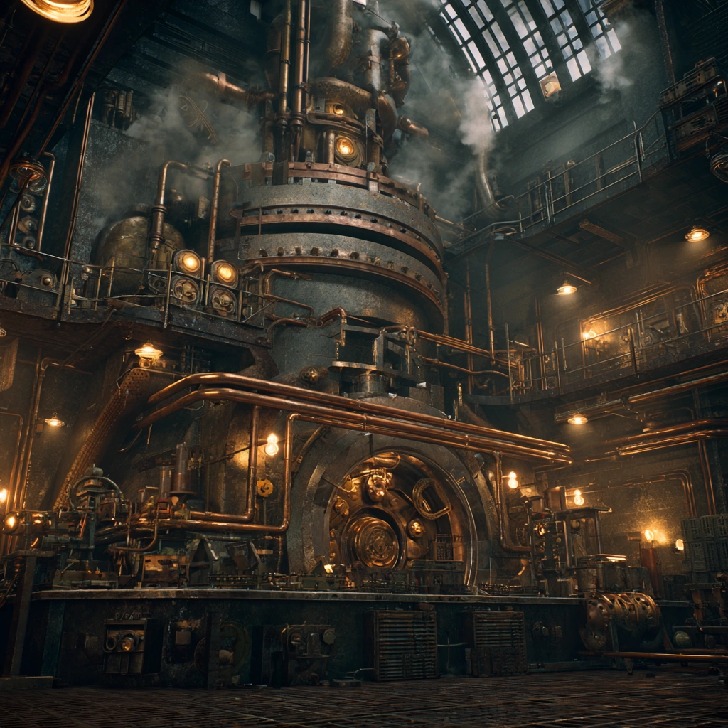 蒸汽朋克工坊CG,齿轮机器与铜管蒸汽,暗金与铁灰色彩,复古工业风格,机械结构复杂,灯光照射金属表面,环境厚重
