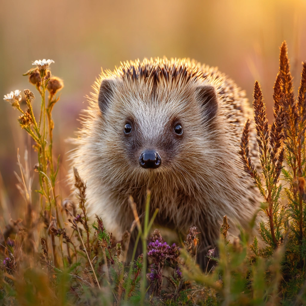 提示词(Prompt) 野花草地,刺猬缓慢移动特写,棕灰尖刺与小巧鼻尖,高清微距动物摄影风格,尖刺排列清晰,夕阳余晖映照草地与刺猬背部,画面温暖宁静 |