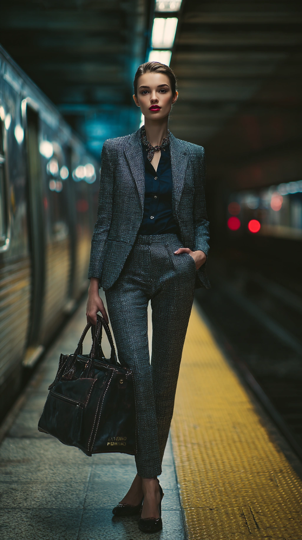 提示词(Prompt) 地铁站台清晨,女模特身着风格西装提手提包,深蓝与银灰色彩,商务都市风格,包包皮革细节,地铁灯光映照人物侧面 --ar 9:16 |