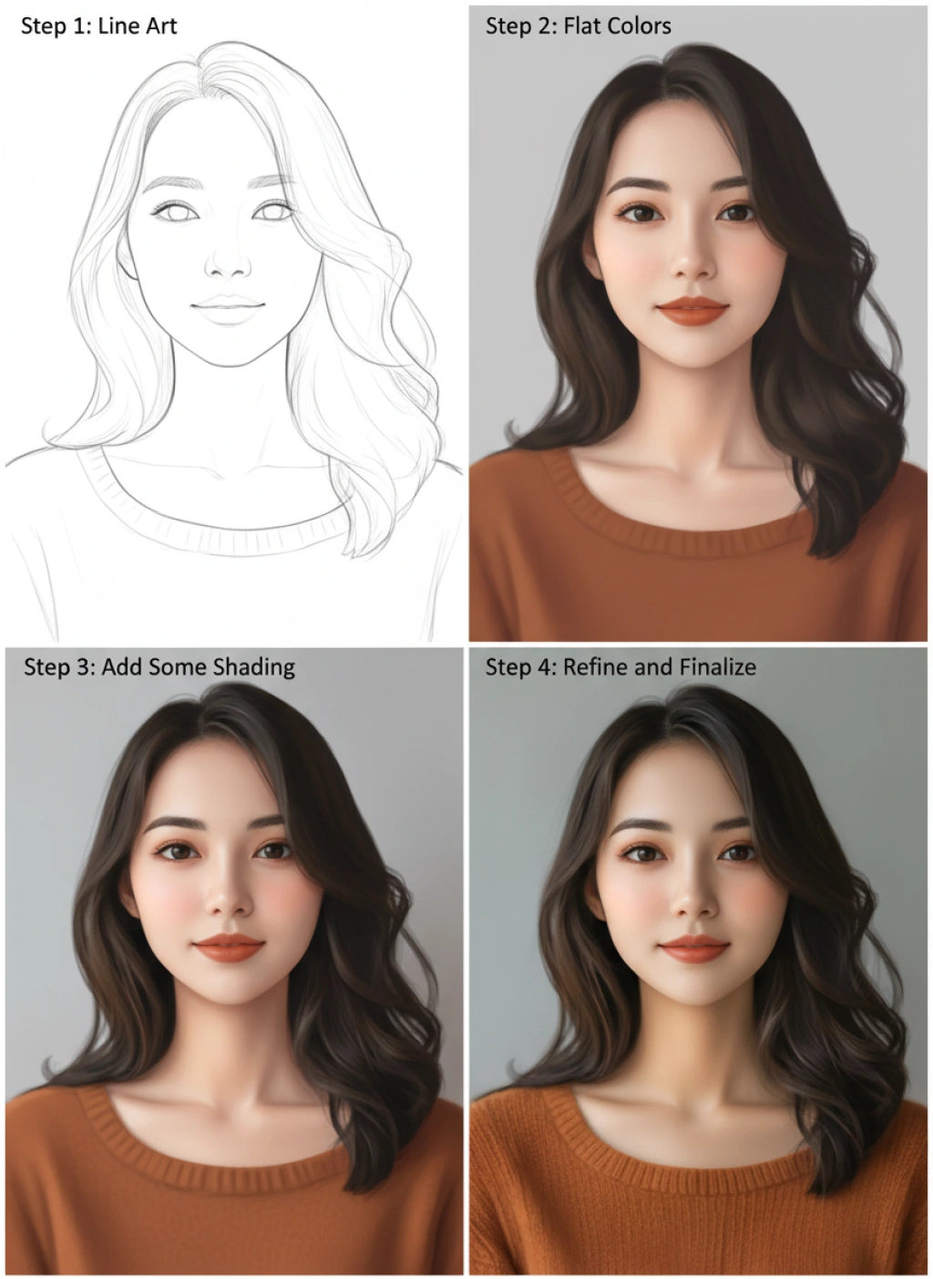 提示词(Prompt) 为人物生成绘画过程四宫格。 第1步:线稿,第2步平铺颜色,第3步:增加一部分阴影,第4步:细化成型 使用的图片 ![]() |