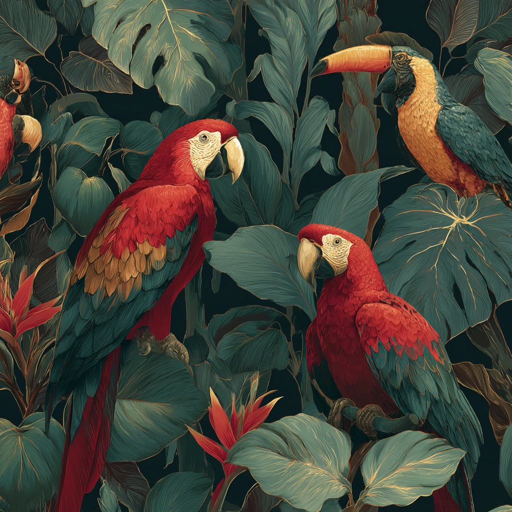 提示词(Prompt) 热带雨林手绘,异域鸟类栖息巨型叶片,深绿与亮红色彩,异域手绘风格,羽毛斑斓精细,叶脉突出,阳光透过树冠洒下斑点 |