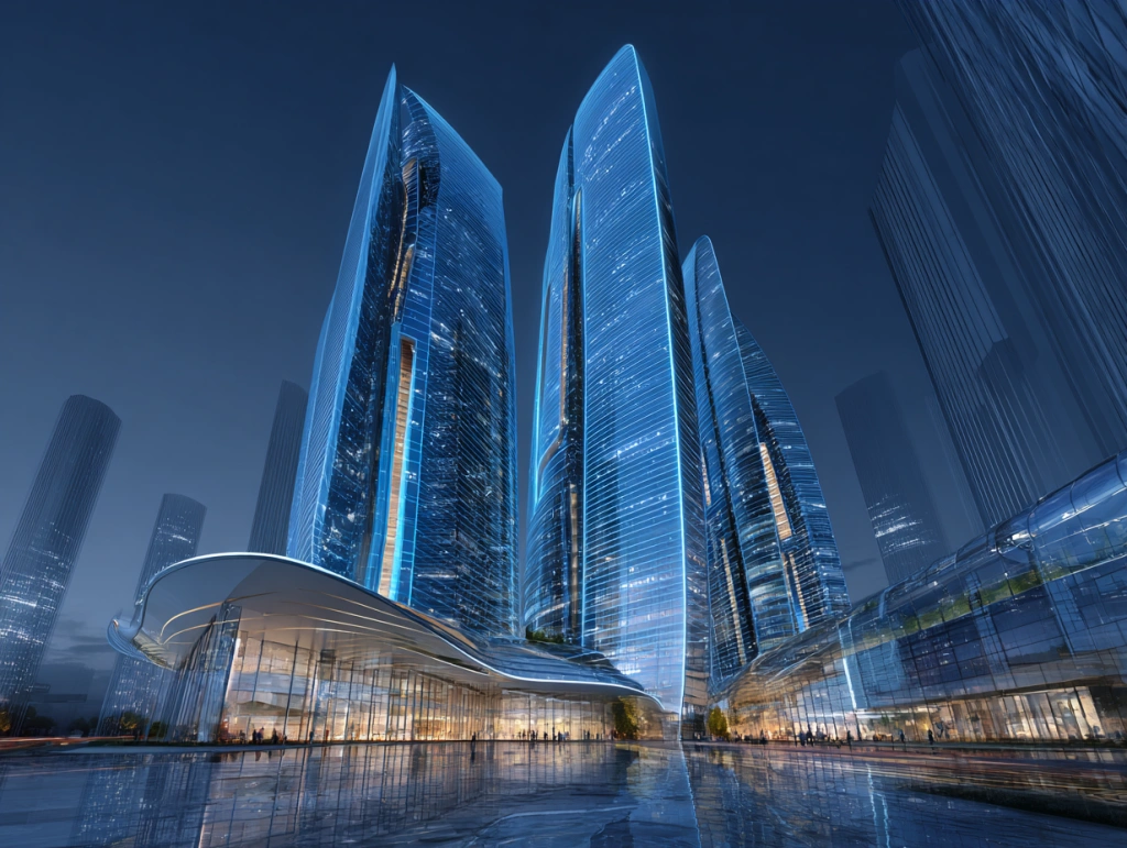 未来主义,流线型建筑,透明玻璃幕墙,蓝色光影,高耸摩天楼,城市夜景,科技感,建筑外立面反射城市灯光,地面微微湿润反射,顶级材质渲染,细致结构,明暗层次分明,建筑设计效果图 --ar 4:3