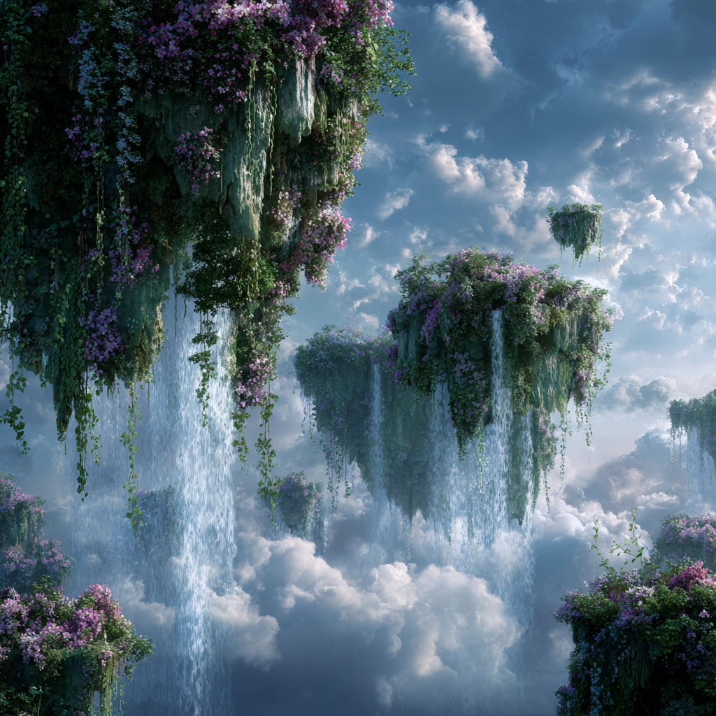空中花园CG,悬浮岛屿与瀑布,绿色与天空蓝色调,幻想风格,花草叶片细腻,水雾与阳光交错,画面浪漫童话