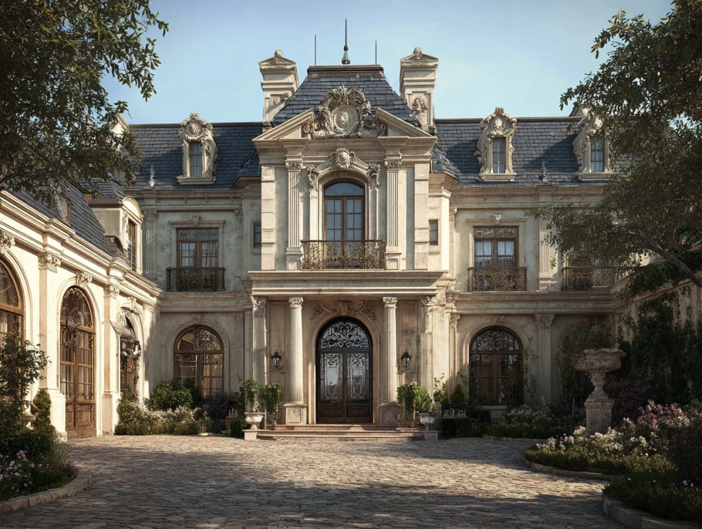 提示词(Prompt) 法式庄园别墅,雕花墙面与喷泉点缀对称花园,米黄与淡金色彩,古典优雅风格,铁艺大门和石雕细节精美,午后暖光投下长影,氛围华丽高贵,建筑设计效果图 --ar 4:3 |