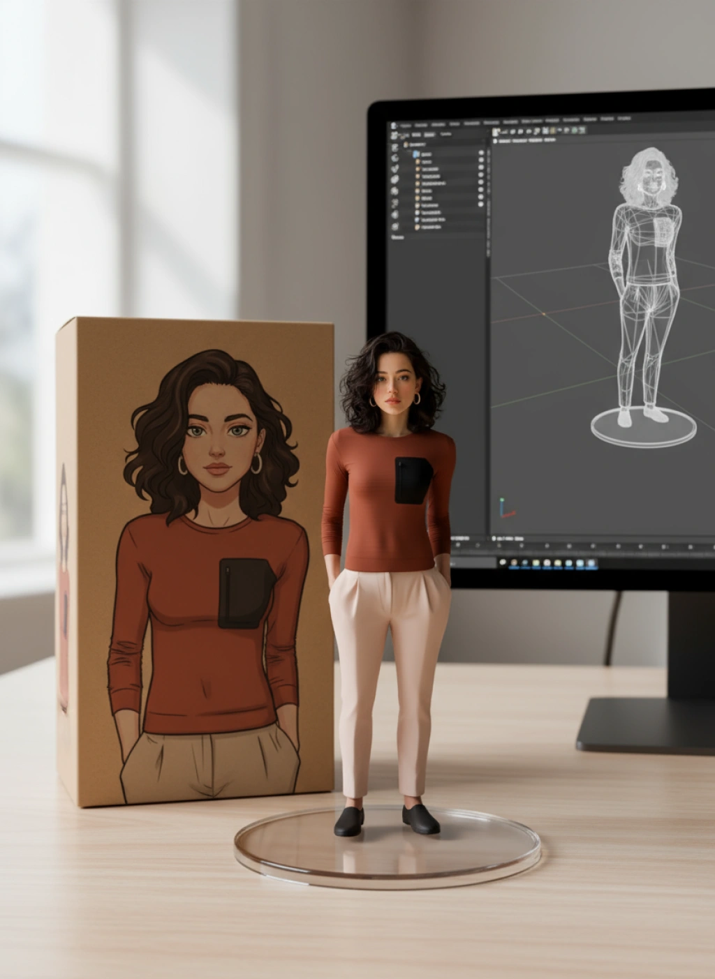 提示词(Prompt) 请把这张照片变成一个人物形象。在它后面,放置一个印有人物形象的盒子。在它旁边,添加一台电脑,其屏幕显示Blender建模过程。在盒子的前面,为人物添加一个圆形塑料底座,并让它站在上面。底座的PVC材质应具有晶莹剔透、半透明的质感,并将整个场景设置在室内。 使用的图片 ![]() |