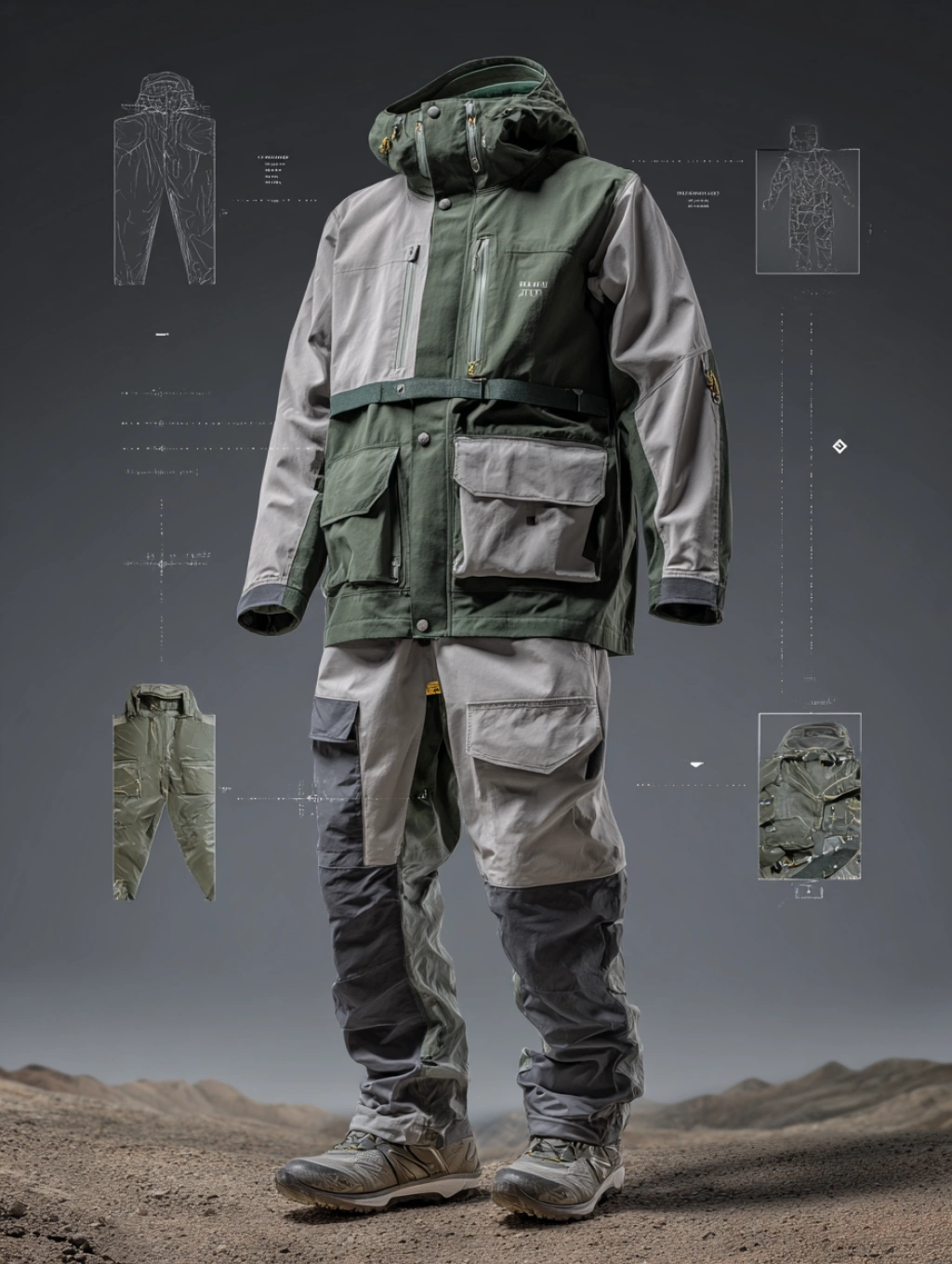 提示词(Prompt) 春季山野摄影,男士多功能风衣与速干裤,墨绿与浅灰色彩,功能性户外风格,风衣帽檐与腰带设计突出,晨光洒落衣物细节,服饰设计效果图 --ar 3:4 |