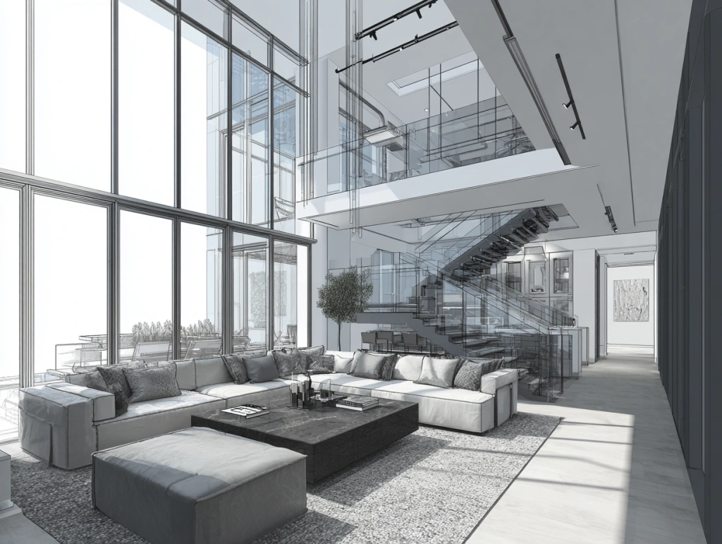 现代复式住宅,双层落地窗和楼梯设计,黑白灰主色调,都市现代风格,玻璃护栏与智能家居细节突出,室内外光线交错,空间层次分明,建筑设计效果图 --ar 4:3