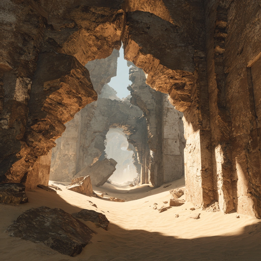 荒漠遗迹CG,断壁残垣与风沙飘扬,土黄与橙棕色调,史诗写实风格,石块裂纹细致,阳光穿透沙尘,空间辽阔苍凉