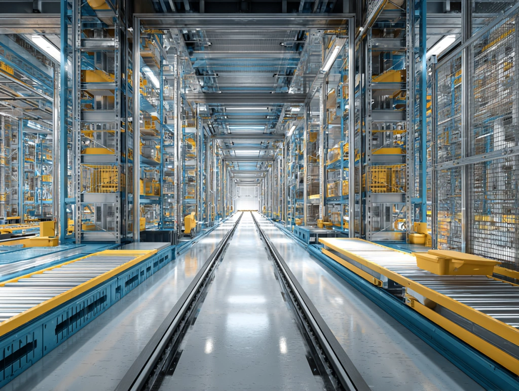 跨境电商物流中心,高大货架和自动分拣设备,蓝灰与亮黄色调,现代科技风格,设备排列和运输轨道细致,冷色灯光与空间层次分明,建筑设计效果图 --ar 4:3