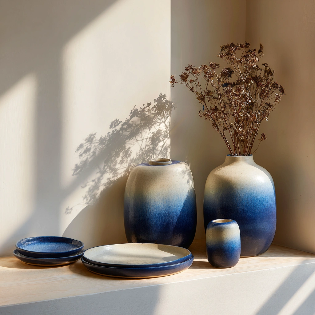 现代陶艺工作室,手工陶瓷花瓶与彩绘盘,暖白与靛蓝色彩,现代简约风格,釉面光滑,花瓶造型流畅,窗外自然光柔和照亮器物表面