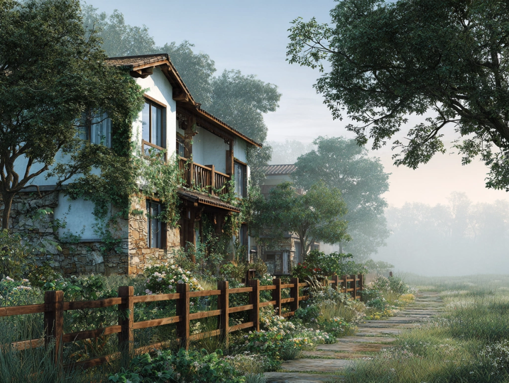 提示词(Prompt) 乡村田园别墅,木屋和石墙环绕花园,米白与草绿色彩柔和,田园风格,藤蔓爬墙、木质栏杆细节丰富,清晨阳光穿透薄雾,温馨静谧,建筑设计效果图 --ar 4:3 |