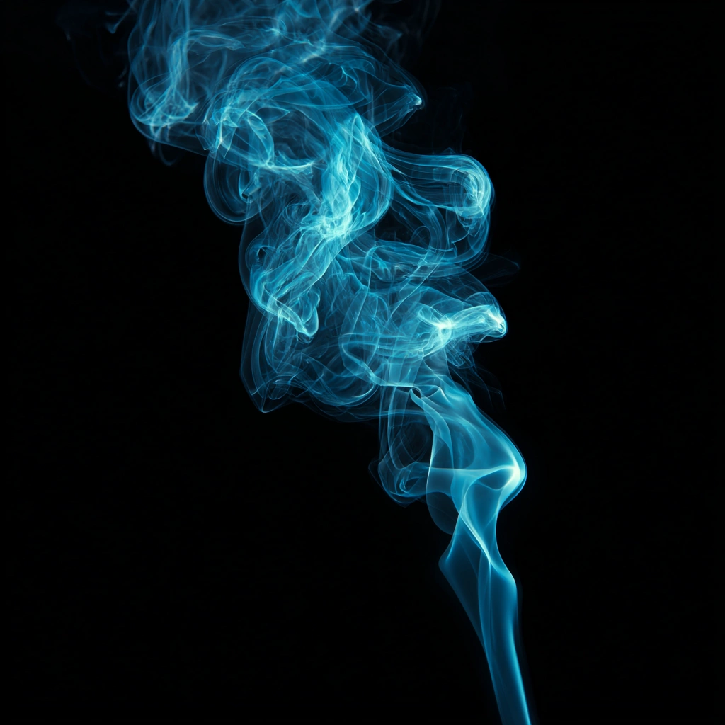 空灵的蓝色烟雾在黑色背景下蜿蜒曲折,艺术而超现实,展现出烟雾的流动性、烟雾卷须的细腻细节、现代审美