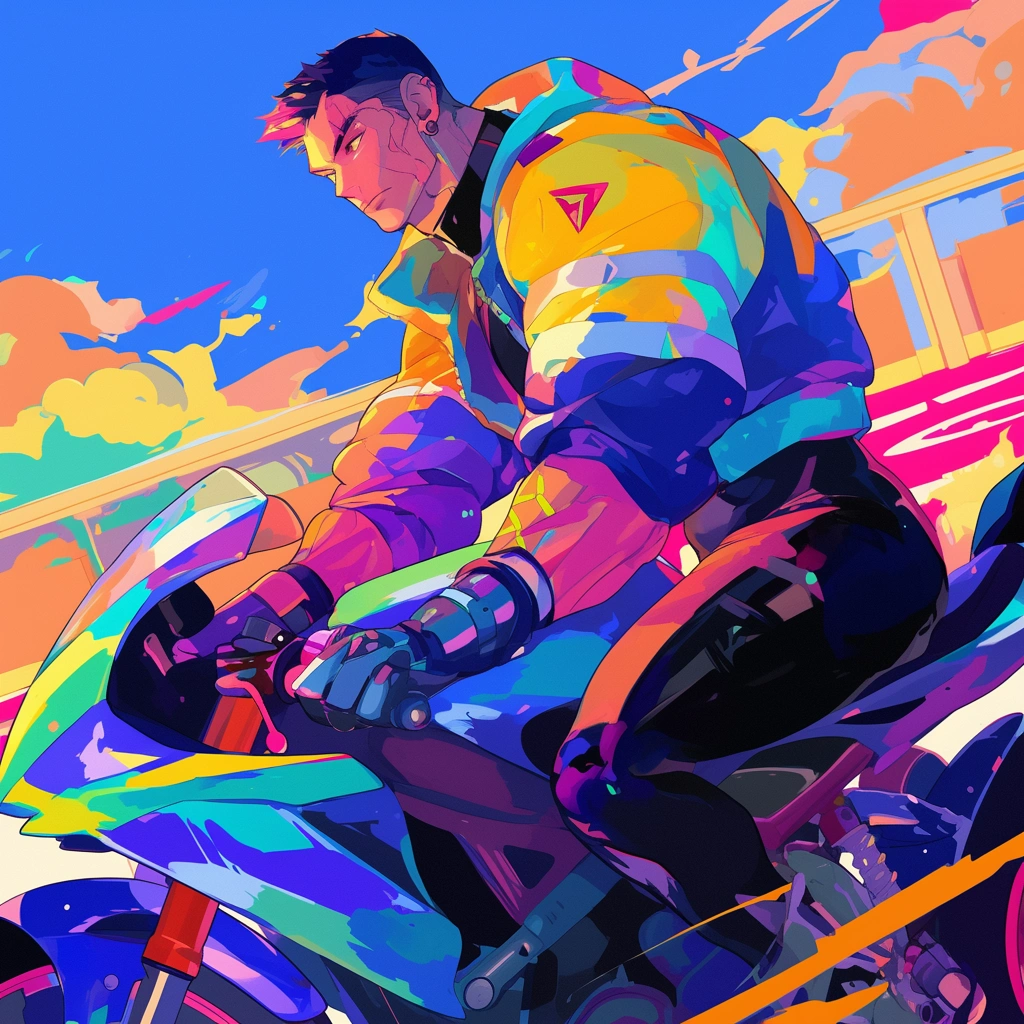 提示词(Prompt) 都市玄幻,帅气的机车男孩,充满活泼的色彩和圆润线条 --niji 6 |