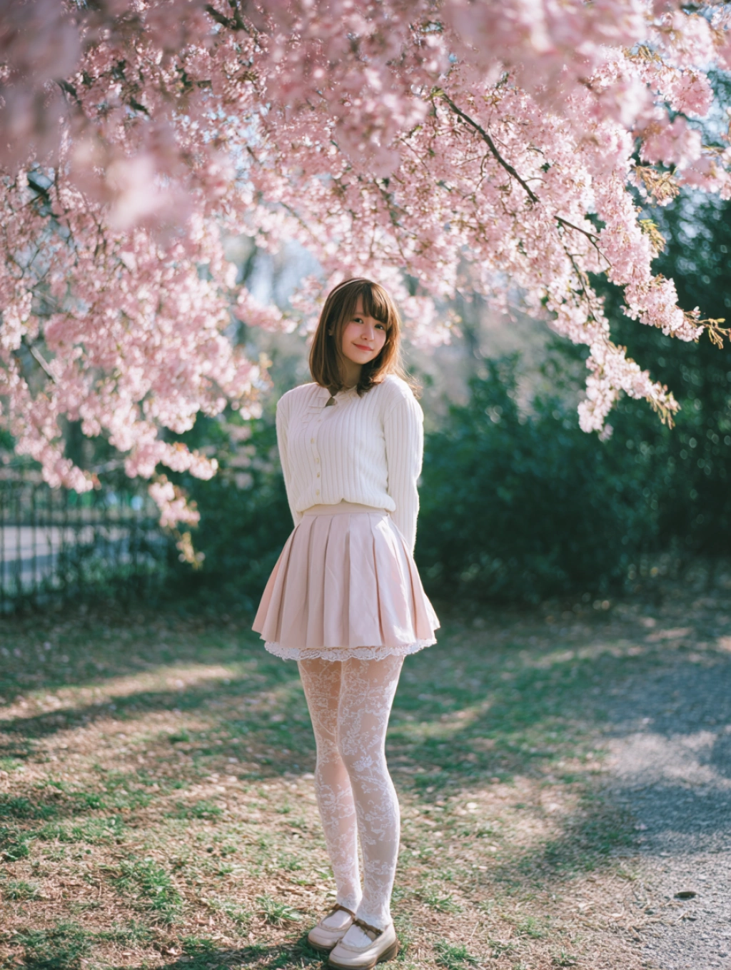 提示词(Prompt) 春日樱花树下,少女身着浅粉色百褶裙和白色蕾丝边丝袜,脚踏小皮鞋,粉嫩与米白色彩,甜美日系风格,裙摆层次柔美,晨光洒落肌肤,画面清新治愈 --ar 3:4 |