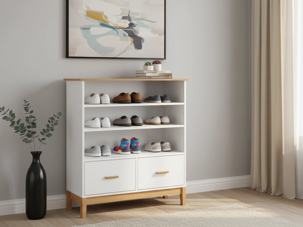 |   | 提示词(Prompt) 在一个现代风格的家庭客厅中,展示一个充满生活气息的鞋柜。鞋柜上摆放着整齐排列的鞋子,旁边放着一些家居装饰物品,墙上挂着一幅抽象艺术画,窗外透过窗帘透进柔和的阳光,营造出温馨舒适的家居氛围。 使用的图片  |