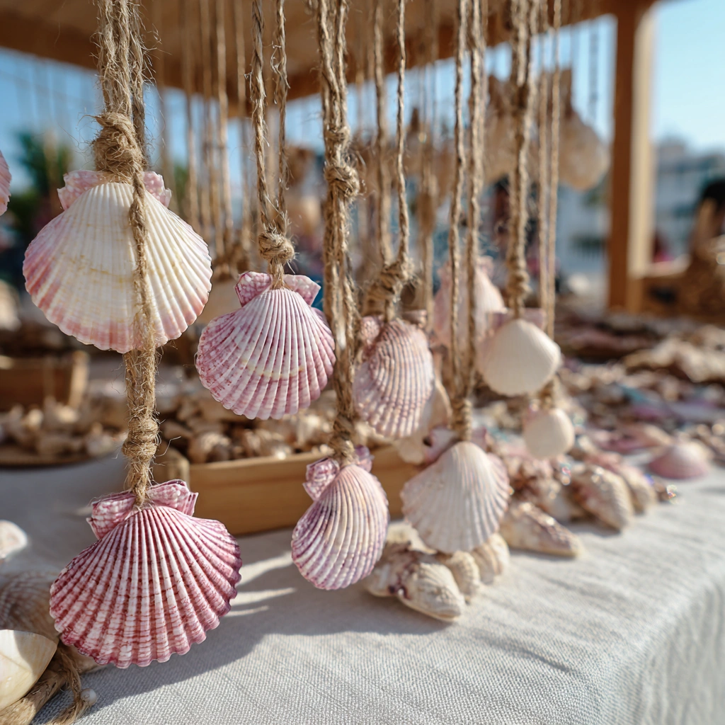提示词(Prompt) 海边贝壳工艺品摊位,贝壳项链与手工挂饰,奶白与浅粉色调,自然风格,贝壳纹理细腻,绳结装饰精美,阳光下贝壳反射柔和光泽 |