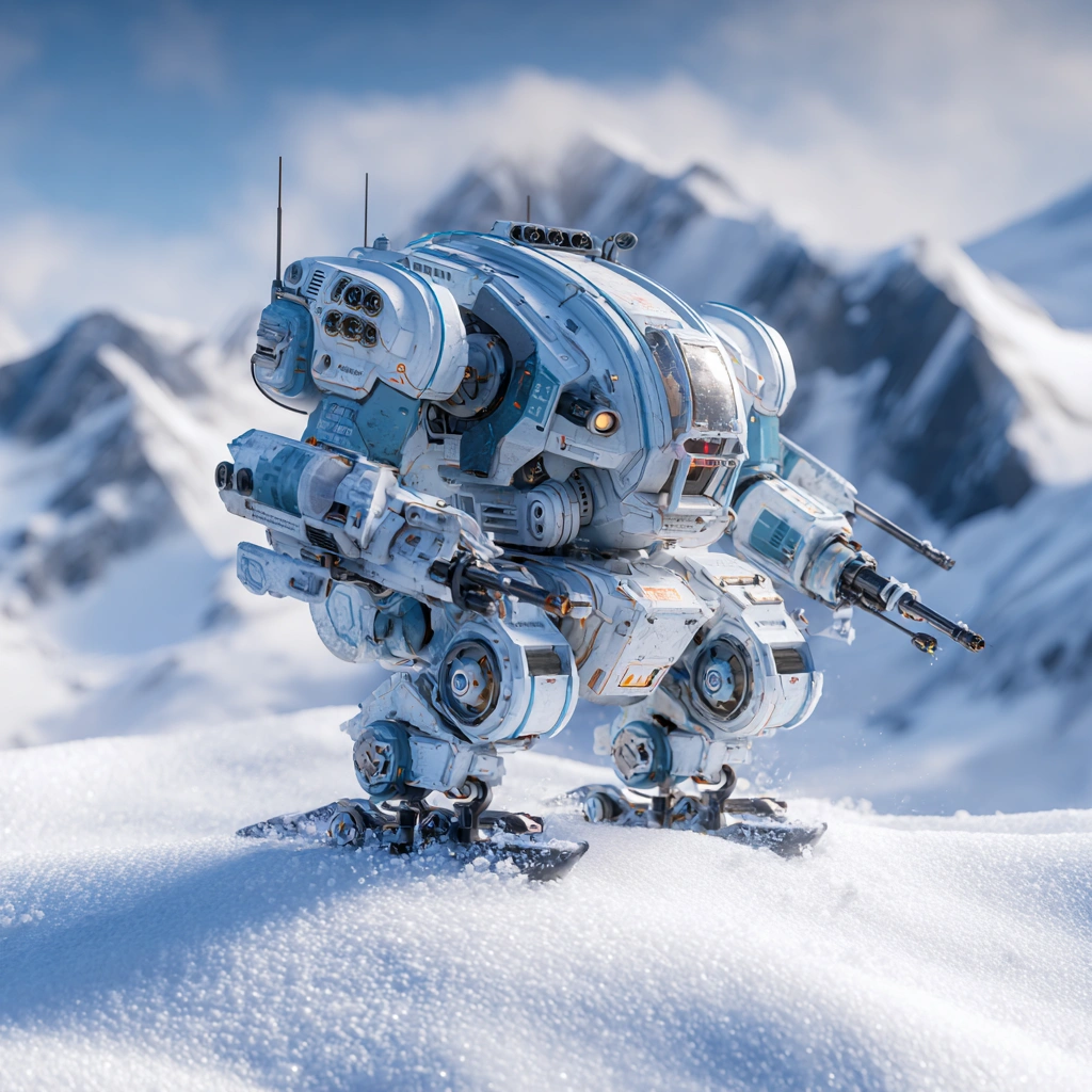 雪山顶峰,机甲重装型正面登场,冷银与冰蓝色彩,极地风格,装甲有冰霜质感,关节处有蒸汽喷射细节,阳光反射雪面照亮机体
