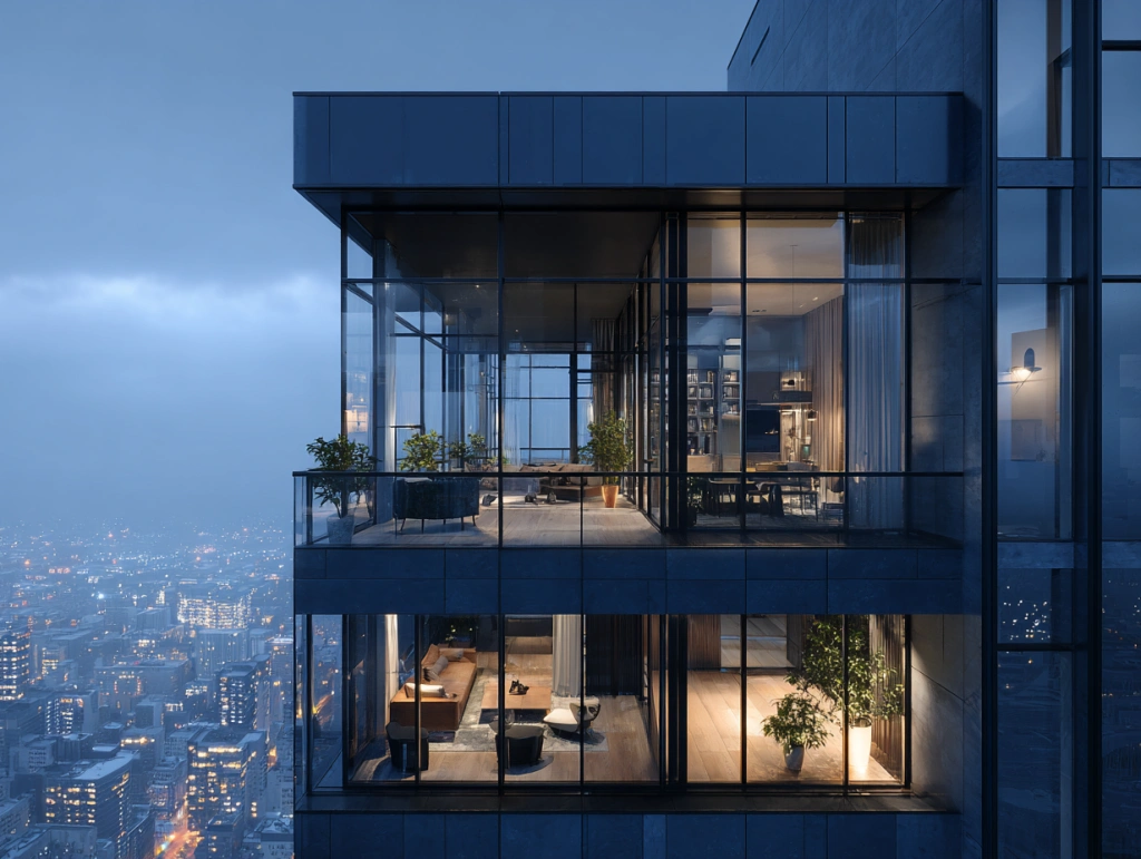 现代高层公寓,采用玻璃幕墙与开放阳台,整体呈冷灰和深蓝色调,极简现代风格,室内配以极简家具和绿植点缀,夜晚城市灯光斑斓反射在窗户上,空间通透,细节精致,建筑设计效果图 --ar 4:3