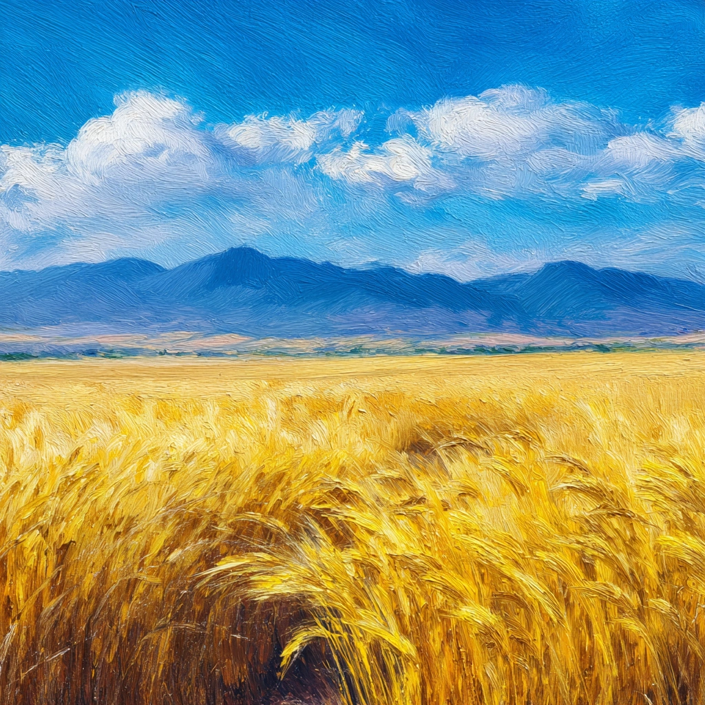 提示词(Prompt) 夏日田野风光,金色麦浪与远山,明亮黄色与蓝天色彩,田园写意油画风格,麦穗纹理清晰,远山有朦胧氛围,阳光洒落画面充满生机 |