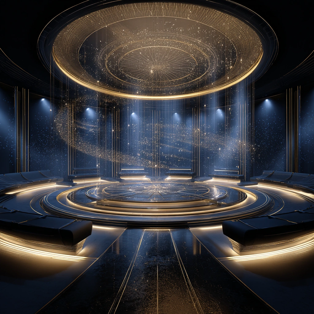 提示词(Prompt) 星际议会大厅,悬浮座椅与全息投影屏幕,深蓝与金色主调,未来权力风格,投影细节精致,灯光勾勒空间边界,气氛庄重现代 |