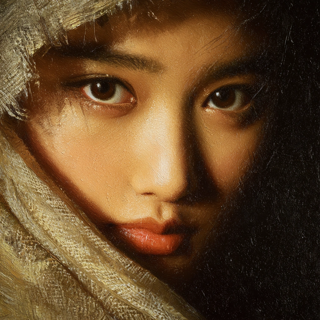 提示词(Prompt) 古典油画风:年轻东方女性,柔和侧光塑造立体面部,肌理厚涂与微妙色彩堆叠,眼眸有湿润高光,肤色细腻暖金,布料质感丰富,背景深色层次 |