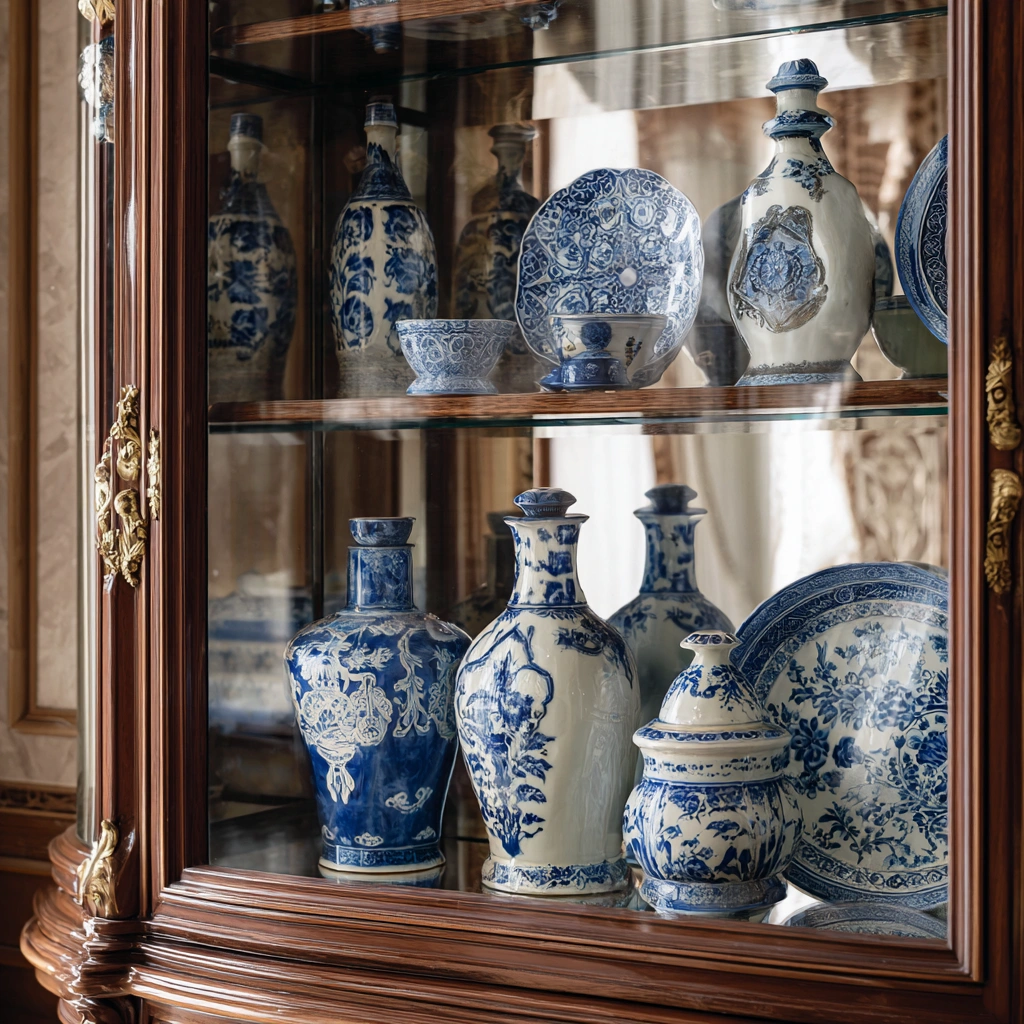 提示词(Prompt) 古风瓷器展柜,青花瓷瓶与手绘盘,白蓝主色调,古典雅致风格,瓷器釉面通透,花纹细节精致,灯光映照瓷面呈现高光与阴影 |