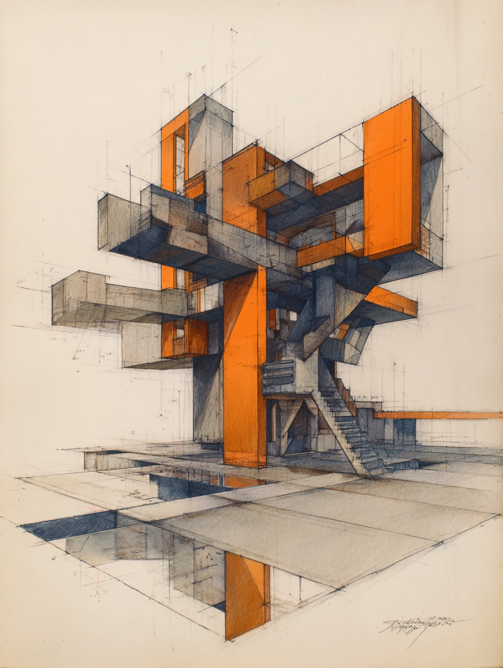 提示词(Prompt) 建筑设计图,抽象未来主义,不规则几何造型,悬浮结构,镜面材质,强烈色块对比,极简线条,高度创意,艺术感爆棚 --ar 3:4 |