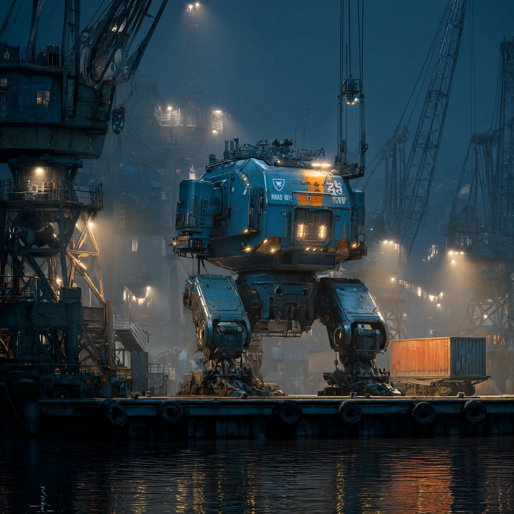 提示词(Prompt) 深夜码头,机甲运输型装载货物,深蓝与钢灰色装甲,工业写实风格,机械臂和履带细节突出,点灯与水面倒影,氛围厚重 |