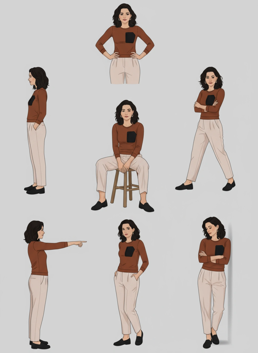 请为这幅插图创建一个姿势表,摆出各种姿势