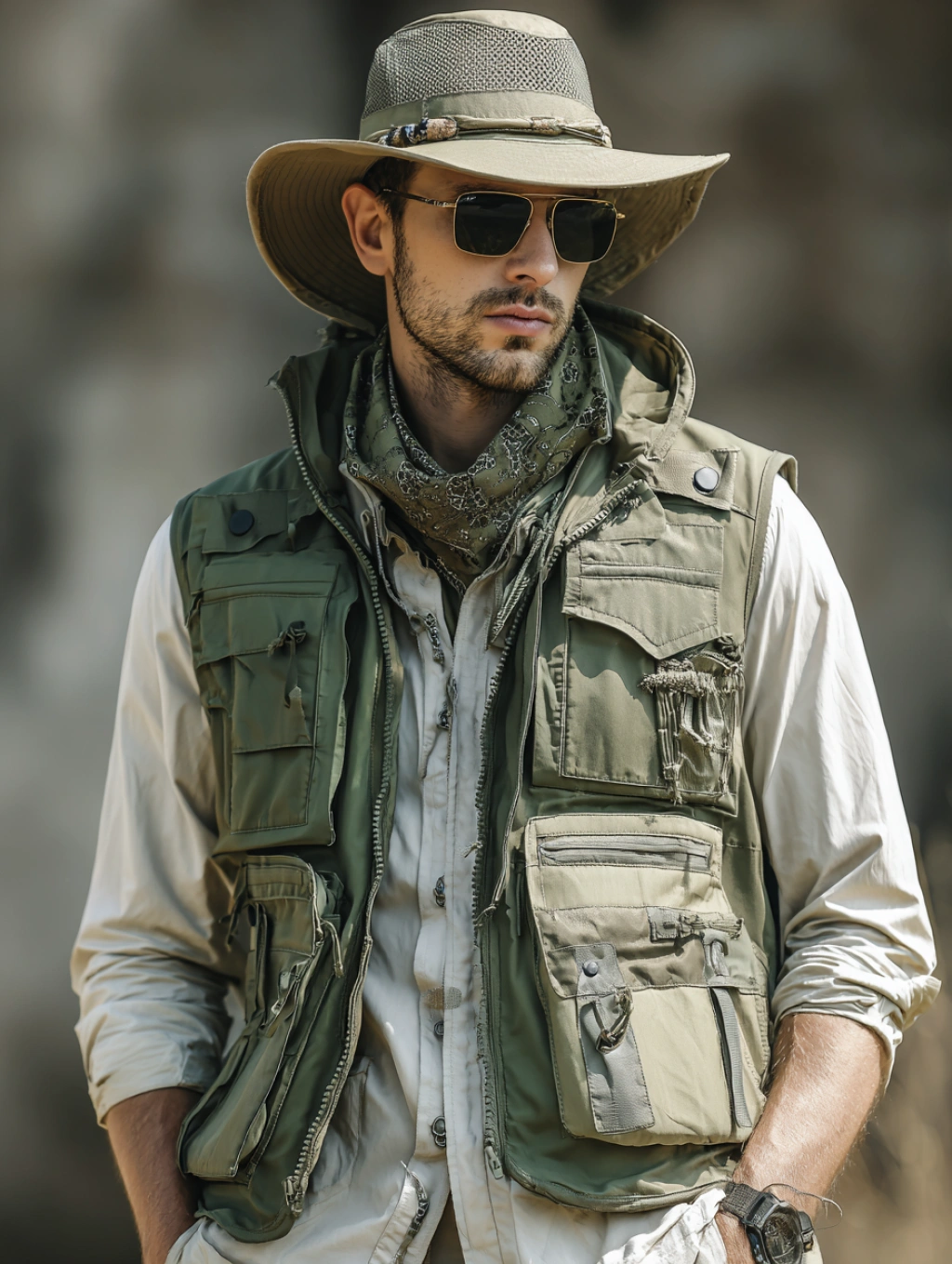 提示词(Prompt) 春季户外采风,男士多口袋马甲与防晒帽,卡其与绿色调,实用户外风格,马甲拉链与帽子装饰突出,阳光下衣物质感清晰,服饰设计效果图 --ar 3:4 |