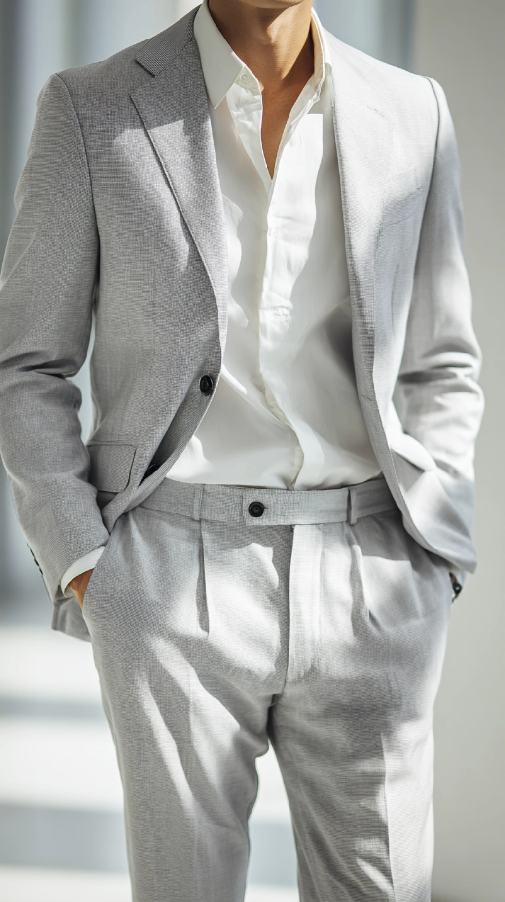 提示词(Prompt) 春季职场面试,男士浅灰色西服配白衬衫,整体色调清新,极简现代风格,西服裁剪利落,室内柔光下呈现干净轮廓,服饰设计效果图 --ar 9:16 |