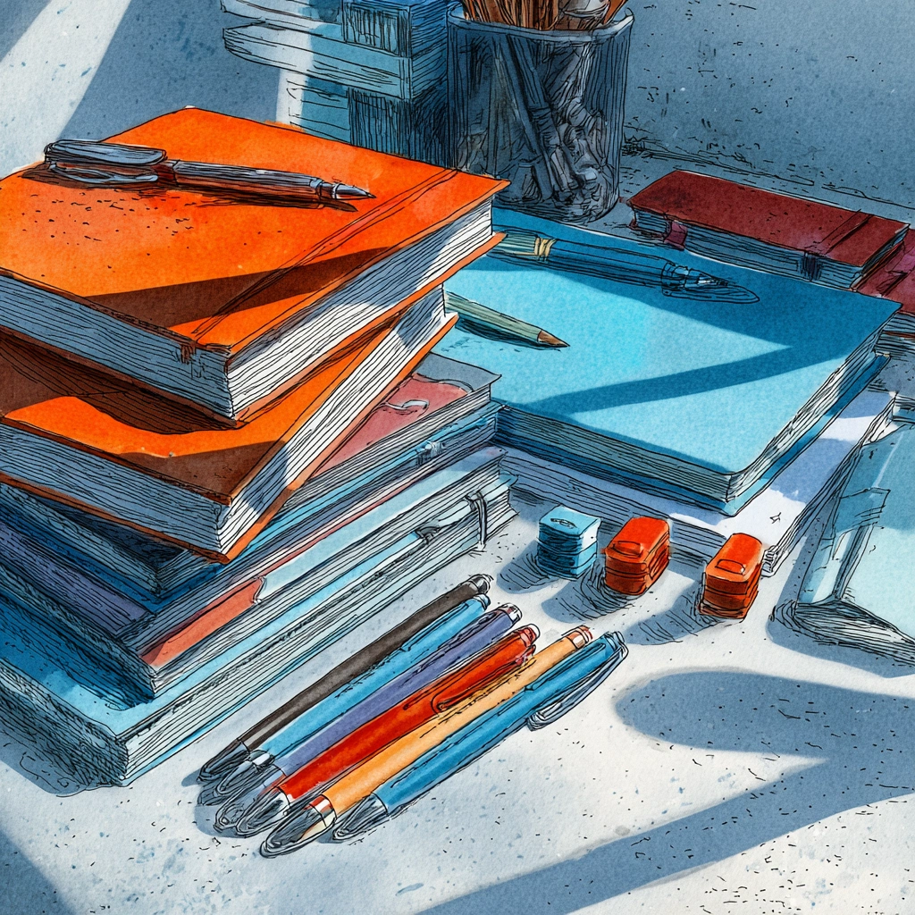 创意文具书桌场景,手账本与彩色笔摆放有序,浅蓝与橙红色彩,文艺插画风格,笔帽和纸张纹理细致,桌面有阳光斑驳,氛围清新